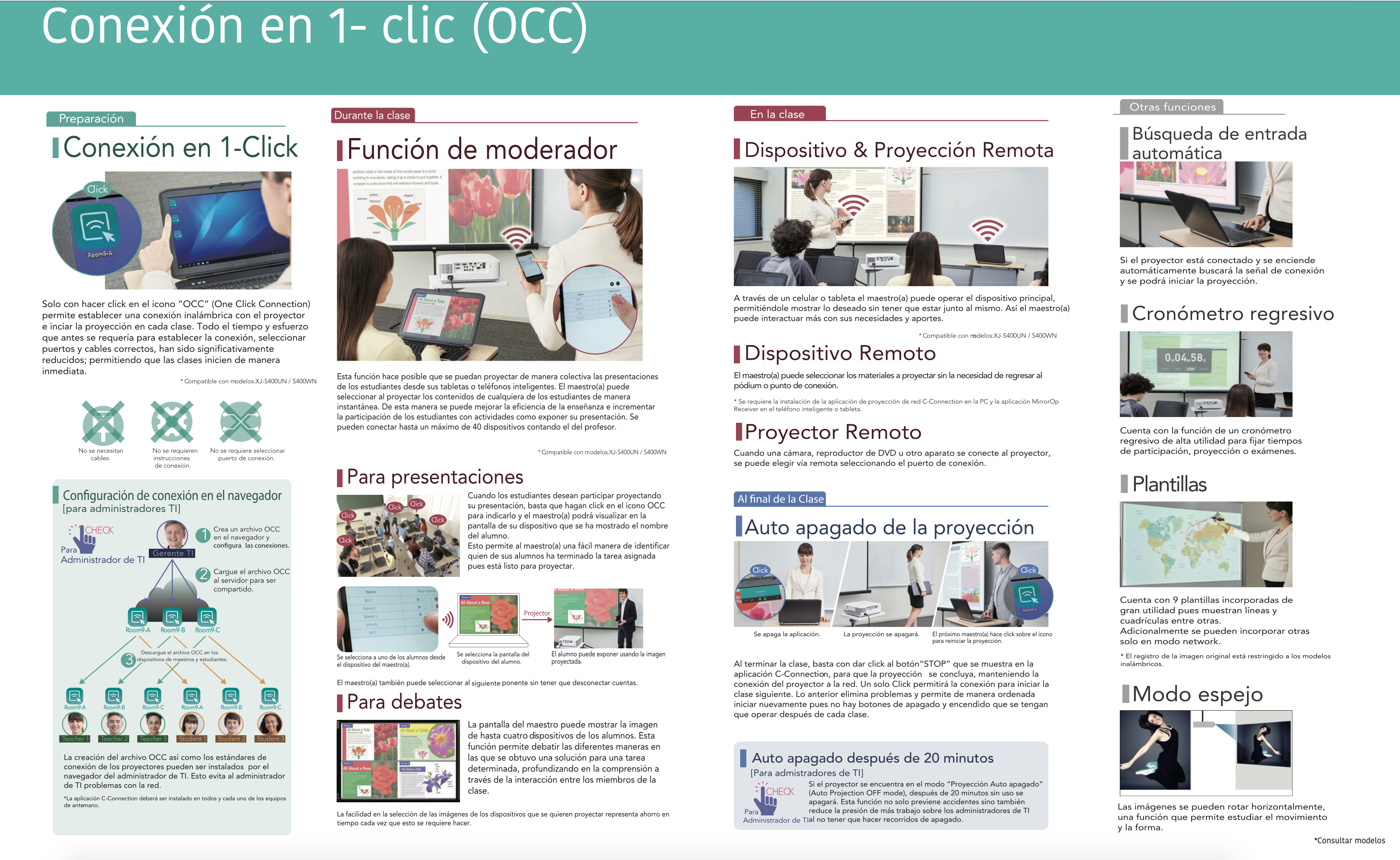 One Click Connection permite estrablecer una conexión inalámbrica con el proyector e iniciar la proyección en cada clase. Todo el tiempo y esfuerzo que antes se requería para establecer la conexión, seleccionar puertos y cables correctos, han sido significativamente reducidos, permitiendo que las clases inicien de manera inmediata.